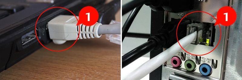 1. เสียบสายแลนที่เครื่องคอมพิวเตอร์ ทั้ง 2 เครื่อง (ช่องต่อสายแลน จะอยู่ด้านหลังเครื่องคอมพิวเตอร์ หรือด้านข้างๆ ถ้าเป็นคอมพิวเตอร์ Notebook)