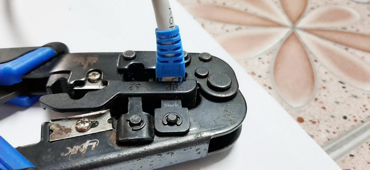 8. นำหัวแลน(Lan) ที่ได้จากข้อ 7 ใส่เข้าไปในคีมย้ำหัว (ใส่จนส่วนหัว RJ45 ที่เป็นพลาสติกใส เข้าไปสุดในคีมย้ำหัว) ตามรูป และทำการบีบคีมย้ำหัวเพื่อทำการเข้าหัวแลน(Lan) RJ-45